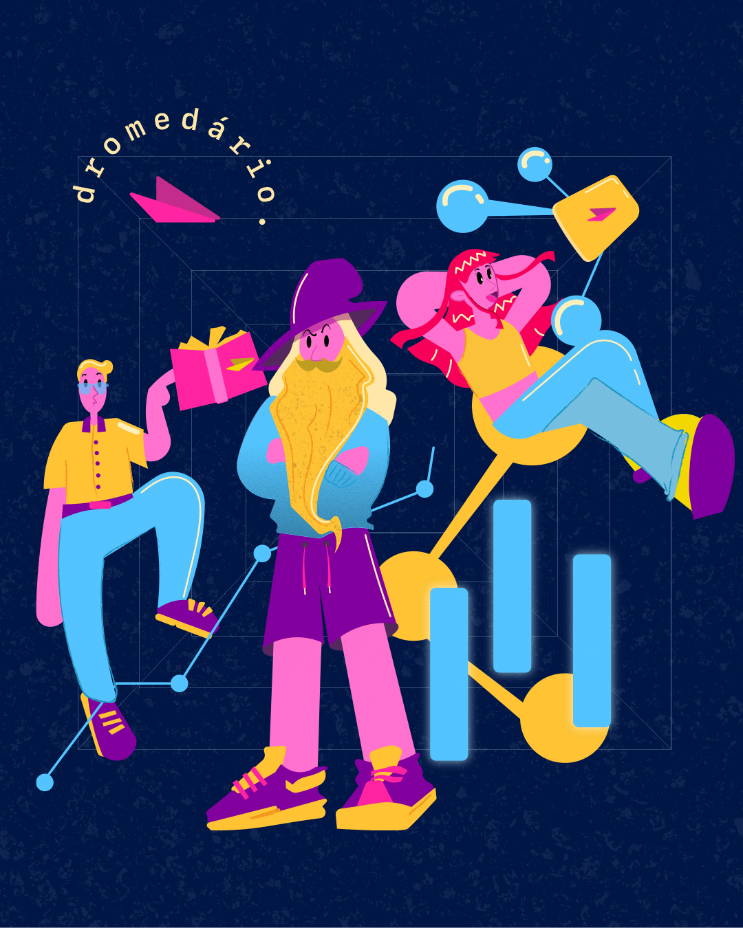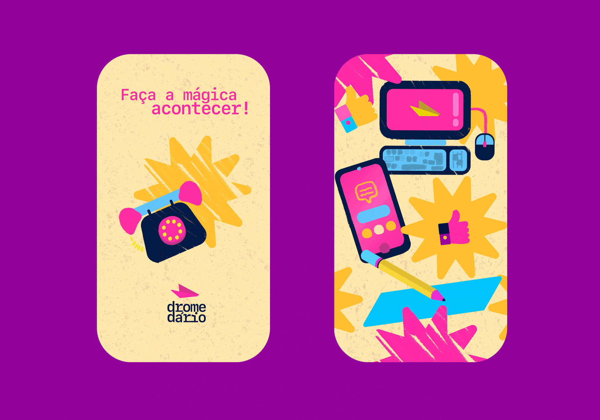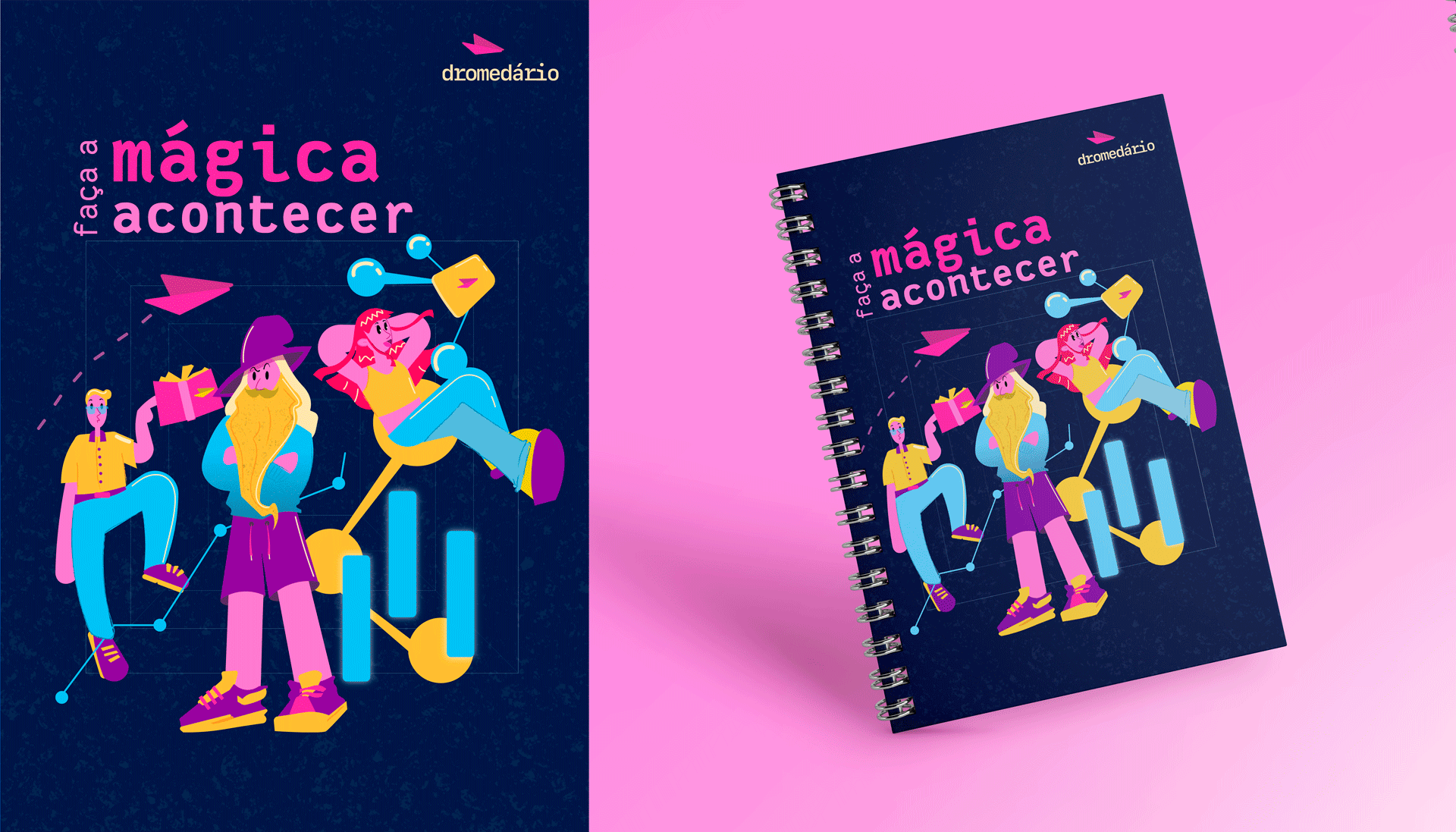 [EN] Dromedário is an agency and school guided by humanization and creativity, which aims to share experiences through technology in a humorous and responsible way. I was invited to develop the visual identity and the entire illustration system for the brand, from art direction to final delivery.