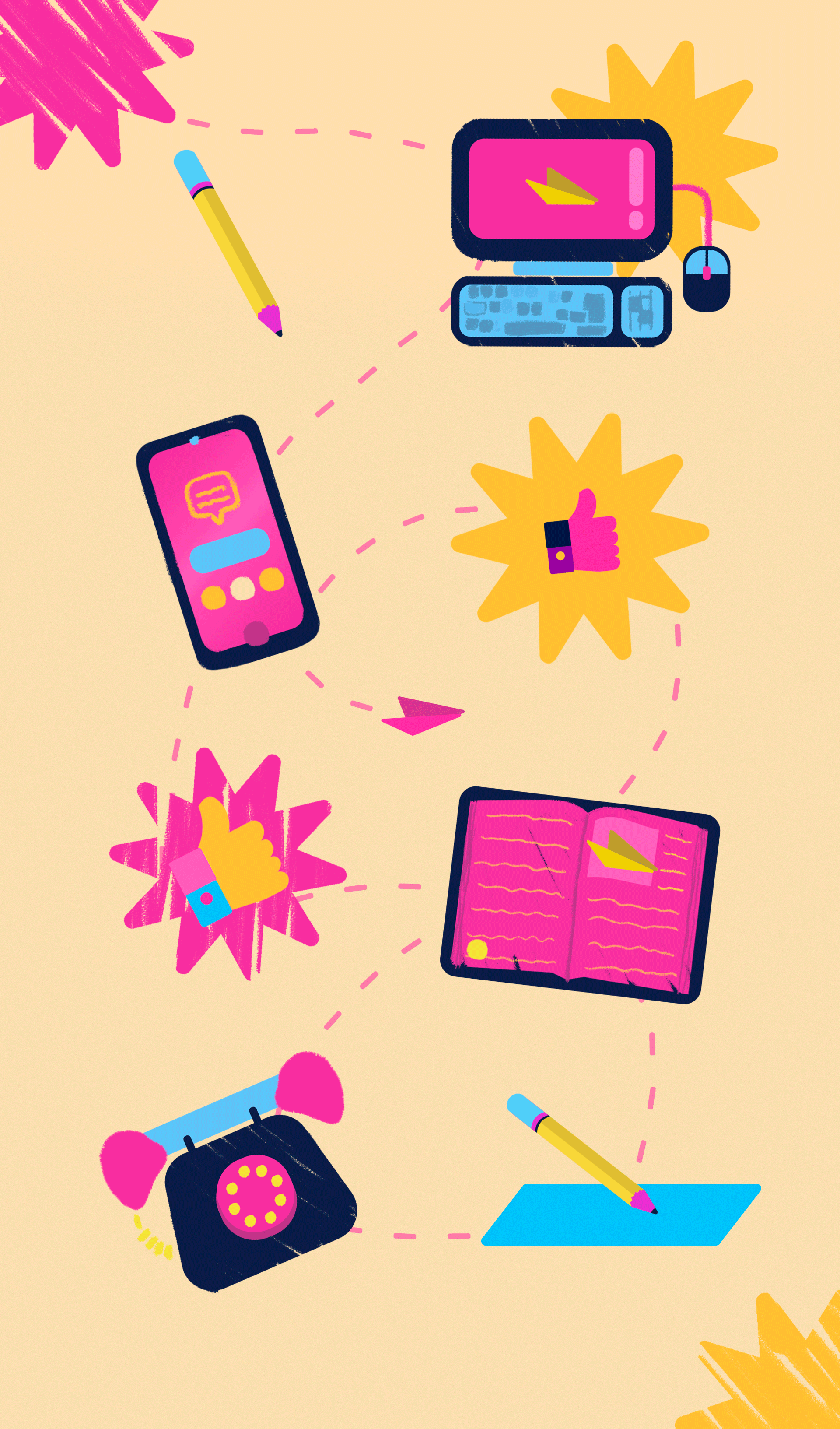 [PT-BR] O sistema de ilustrações explora formas de comunicação, ou melhor, meios de compartilhamento de experiências que foram importantes ao longo da história. A escolha de família de tipográfica monoespaçada, aconteceu porque esse tipo de fontes remete ao início da computação, momento em que as relações digitais se davam de forma mais orgânica e humana.