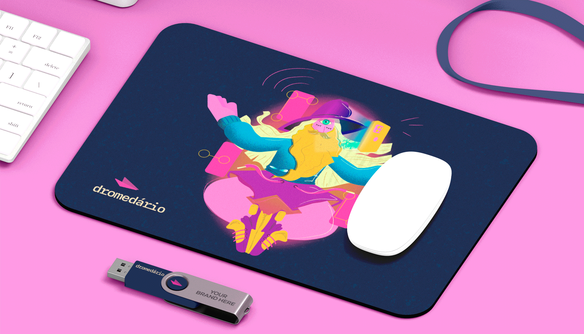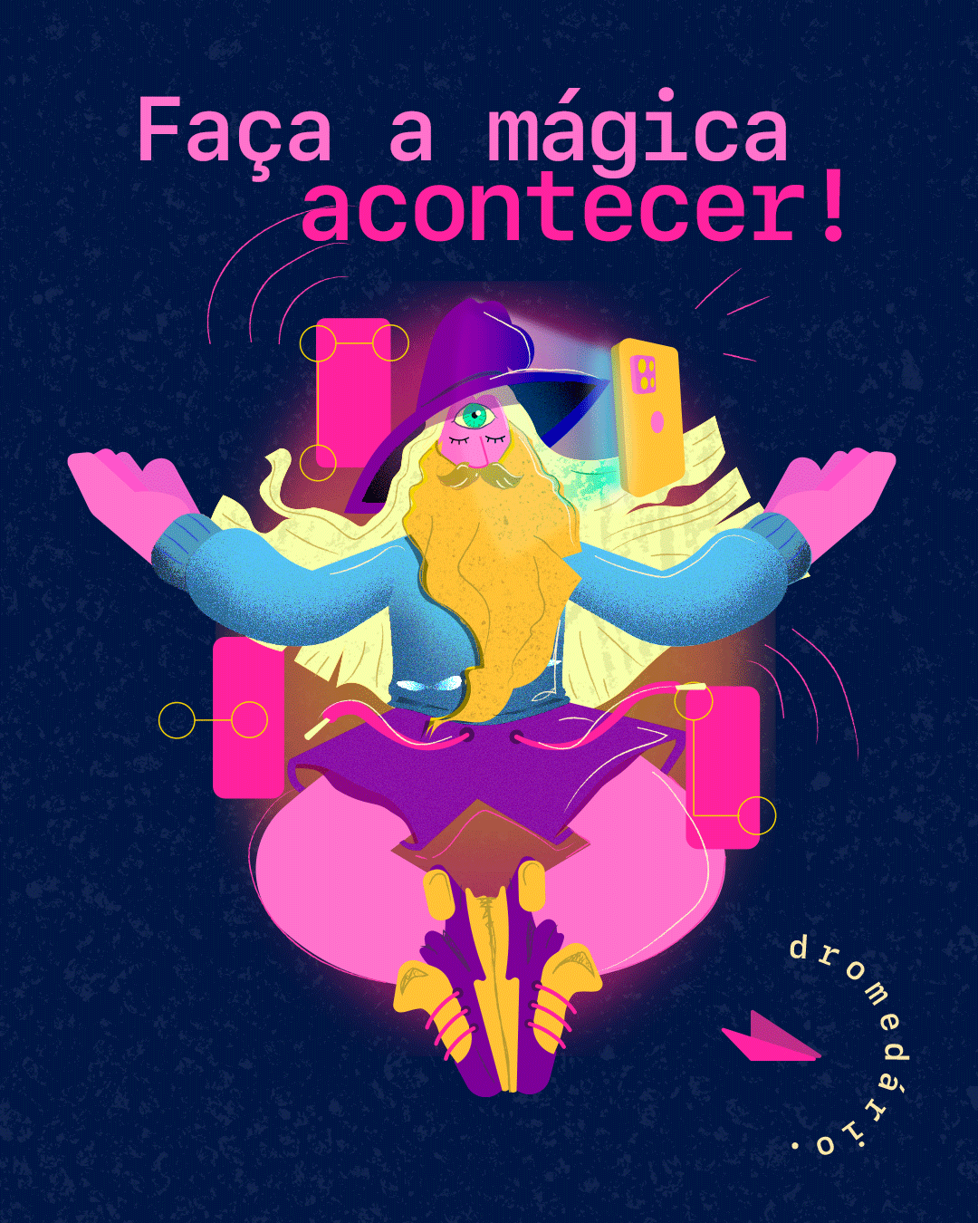 [PT-BR] Minha pesquisa partiu de alguns termos levantados durante o briefing, entre os quais se destacavam: "compartilhar", "inovador", "responsabilidade" e "bem humorado". Compreendi que a Dromedário se propunha uma empresa ágil, própria do universo digital, que ensina e atende com olhar especial à praticidade e à experiência do cliente, de tal forma que não seria possível fazer em outro momento da história, e que, caso fosse, só poderia ser interpretado como mágica.